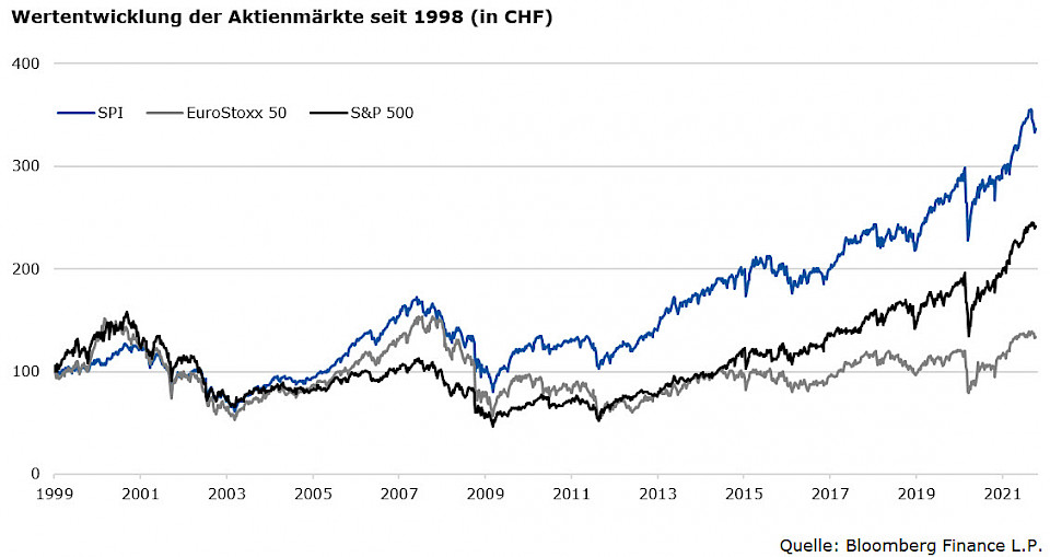 Der Schweizer Aktienmarkt könnte das dritte Jahr in Folge mit einer positiven Rendite abschliessen: Trotz der jüngsten Gewinnmitnahmen liegt der SPI seit Jahresbeginn weiterhin deutlich im Plus. Noch interessanter als die gute Wertentwicklung der letzten Jahre ist der Blick auf die langfristige Entwicklung seit 1998: Wer sein Geld in Schweizer Aktien investiert hat, konnte sein Vermögen mehr als verdreifachen. Mit dieser Performance übertraf der SPI nicht nur den europäischen Aktienindex EuroStoxx 50, sondern auch den US-Aktienindex SP 500.