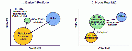Die Anlegerschaft wird sich dieser neuen Realität aus niedrigen risikofreien Renditen, zunehmender Ungewissheit und volatiler Aktienerträge wohl insofern anpassen, als dass man bei der Portfolio-Allokation von einer Barbell-Struktur (starke Gewichtungen an den beiden Enden des Risikospektrums: Bundesanleihen und risikoreiche Aktien) zu einer Konzentration auf den mittleren Bereich übergeht (mit Schwerpunkt auf gering volatile Ertragstitel). Den Kern eines solchen Portfolios bilden Rententitel mit Risikoaufschlag, wie Hochzinsanleihen, IG-Unternehmensanleihen, Covered Bonds, Staats- und Unternehmensanleihen von den Emerging Markets, Asset Backed Securities und Mortgage Backed Securities. Alle Werte, die einen deutlichen Spread-Pickup gegenüber Bundesanleihen bieten, eignen sich für diese Allokationsstrategie. Die Strukturierung der entsprechenden Portfolios erfolgt auf Basis dieser Art von Fixed-Income-Titeln. Anleger, die sich um steigende Zinsen oder Inflationsraten sorgen, können dieses Risiko mithilfe von Derivaten mindern.