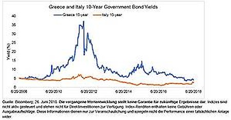 Aumiller glaubt, dass all dies die derzeitige Besorgnis über die schwelenden wirtschaftlichen und politischen Schwierigkeiten Italiens relativieren sollte. Die Reaktion italienischer Anleihen auf die aktuelle Regierungszusammensetzung wurde durch die Bewegungen im griechischen Anleihenmarkt in den Schatten gestellt. Das soll nicht heissen, so Aumiller, dass die Probleme Italiens klein sind: Als viertgrösste Volkswirtschaft in der Eurozone könnten selbst kleine Schwierigkeiten vor Ort grosse Auswirkungen auf die gesamte Region nach sich ziehen.