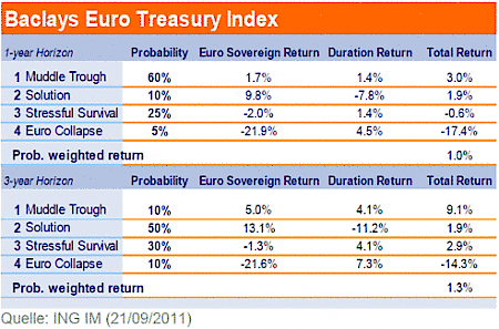Dies ist das Worst-Case-Szenario: Nicht nur würden mehrere Länder einen Staatsbankrott anmelden und die EWU verlassen, auch die deutsch-französische Achse würde zerbrechen und damit die Europäische Union. Am Ende stünde lediglich eine Euro-Mark-Zone, der Deutschland, die Niederlande, Finnland, Österreich und Luxemburg angehören. Die übrigen EWU-Mitglieder würden dann wieder ihre alten Währungssysteme einführen. Im Rahmen dieses Szenarios gehen wir von folgenden Risikoabschlägen aus: 80% für Griechenland, 60% für Irland und Portugal, 40% für Italien und Spanien sowie 20% für Belgien und Frankreich. Auf Jahressicht könnte dieses Szenario mit einer 5%igen Wahrscheinlichkeit eintreten, die über einen Dreijahreszeitraum auf 10% steigt.