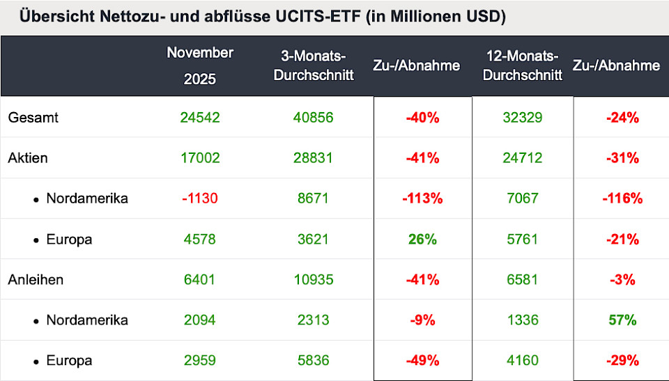 Laut Fidelity wuchs der weltweite ETF-Markt im November «nur» um 25 Milliarden Dollar. Massgeblich waren Abflüsse aus US Aktienprodukten von etwas mehr als einer Milliarde Dollar. Zum Vergleich: Im 12-Monatsschnitt flossen jeweils gut 7 Milliarden Dollar neu in den US-Markt.