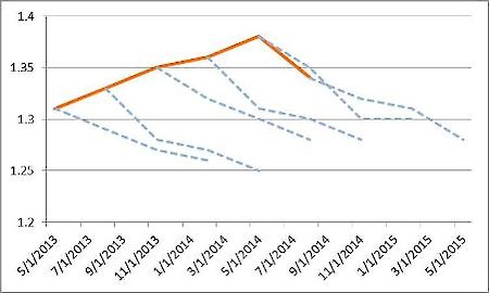 Einige Analytiker sind an einem Punkt angelangt, wo sie sich über den Euro ärgern. Wie oft haben sie schon darauf hingewiesen, dass der Euro doch schwächer sein müsste dabei wird er nach wie vor bei 1,34 gegenüber dem US Dollar gehandelt! Zugegeben, der Euro steht zwar unter der 1,37 1,39 Marke, in dieser Spanne hat er sich bereits Mitte Februar bis Mitte Mai dieses Jahres bewegt. Dennoch war angesichts der Abweichungen zwischen der Fed und der EZB, dem enttäuschenden Wirtschaftswachstum in der Eurozone gegenüber der wirtschaftlichen US-Erholung, sowie den möglichen Auswirkungen der Sanktionen gegen Russland mit einem wesentlich schwächeren Euro gerechnet worden. Und dies bereits seit über einem Jahr, wie die wie die folgende Grafik veranschaulicht: