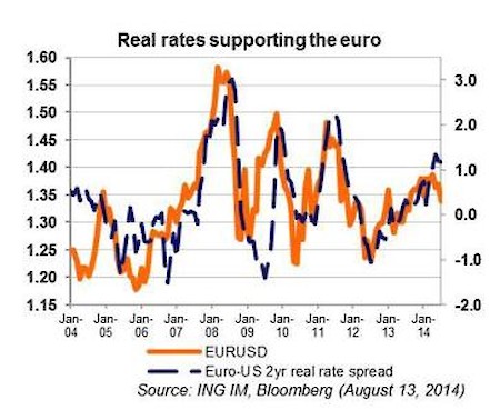 Zum anderen haben sich die Realzinsen seit Mitte 2012 zugunsten des Euros bewegt. Obwohl etwas gegensätzlich, so war das niedrige Niveau der Inflation in der Eurozone ein wichtiger Grund für diese Bewegung der Realzinsen.