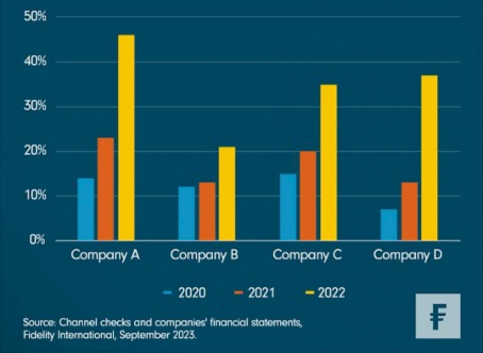 Fidelity International befasste sich mit der Frage, wie diese Unternehmen zunehmend feststellen, dass Auslandsmärkte nicht nur eine Quelle für Umsatzwachstum, sondern auch für eine bessere Rentabilität sind. Dazu gehören Firmen wie ein grosser Hersteller von Kippern, Baggern und Zementmischern, das als Unternehmen A bezeichnet wird; oder Unternehmen B, das Hydraulikpumpen und -ventile herstellt; Unternehmen C, ein Hersteller von Gabelstaplern; und Unternehmen D, das Schwerlastwagen und Sattelauflieger produziert. Alle diese führenden Industriemaschinenhersteller haben Fabriken gebaut oder Vertriebsniederlassungen in Märkten wie den USA, Europa, Afrika oder Südostasien gegründet. Es ist ihnen auch gelungen, schnell Marktanteile zu gewinnen. Wie die Grafik zeigt, konnten alle vier Unternehmen ihre Auslandsumsätze vor allem im vergangenen Jahr deutlich steigern.