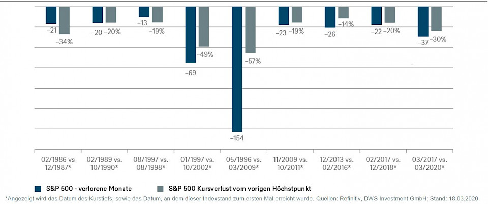 Der S&P 500 Index liegt infolge der Corona-Krise rund ein Drittel unter seinem Höchststand. Damit sind alle Kursgewinne seit Anfang 2017 dahin. 2009 sah es noch schlimmer aus, ebenso wie an Europas Börsen heute. DWS zeigt im Chart der Woche die zwei Dimensionen der Marktkorrekturen des S&P 500 auf.