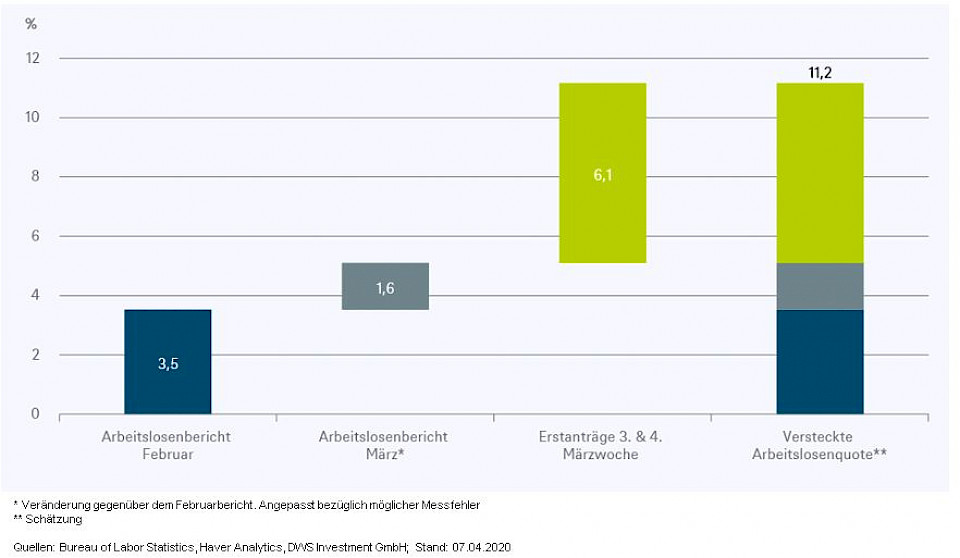 Das "Chart of the Week" von DWS versucht eine erste Antwort. Dabei berücksichtigen sie sowohl mögliche Messfehler als auch andere Datenquellen. In der Woche zum 28. März hat sich etwa die Zahl der US-Erstanträge auf Arbeitslosenhilfe fast verdoppelt. Insgesamt haben innerhalb dieser zwei Wochen fast 10 Millionen Menschen ihren Arbeitsplatz verloren (Stand: 03.04.2020). Das, plus diverse Messfehler deuten bereits auf eine versteckte Arbeitslosenquote von gut 11% hin.