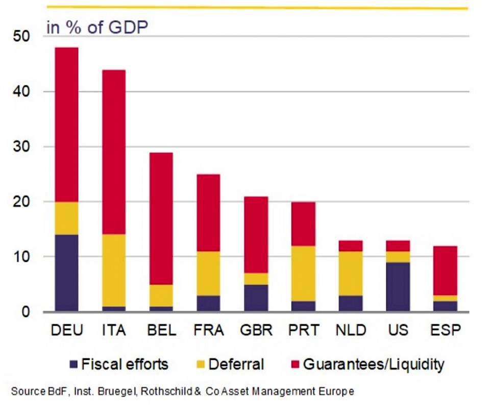 In der Eurozone hat sich die EZB dazu verpflichtet, umfassende Massnahmen zur Unterstützung der Wirtschaft zu ergreifen, und ihre Ankäufe von Vermögenswerten erhöht, hauptsächlich durch das Pandemie-Notkaufprogramm (PPP) von 1'350 Mia. Euro, wobei die Nettokäufe voraussichtlich mindestens bis Juni 2021 andauern werden. In Ermangelung europäischer Finanzkapazitäten wurde die finanzpolitische Reaktion auf die Krise bisher fast ausschliesslich den nationalen Haushalten überlassen, wobei die Regierungen Massnahmen wie Einkommensunterstützung für Privathaushalte, Steuerstundungen, Garantien für öffentliche Darlehen und kurzfristige Arbeitsregelungen beschlossen haben. Es wird jedoch erwartet, dass die Arbeitslosenzahl in den kommenden Monaten steigt, da die Beschäftigungssubventionen auslaufen, die Insolvenzen zunehmen und die Menschen auf den Arbeitsmarkt zurückkehren.