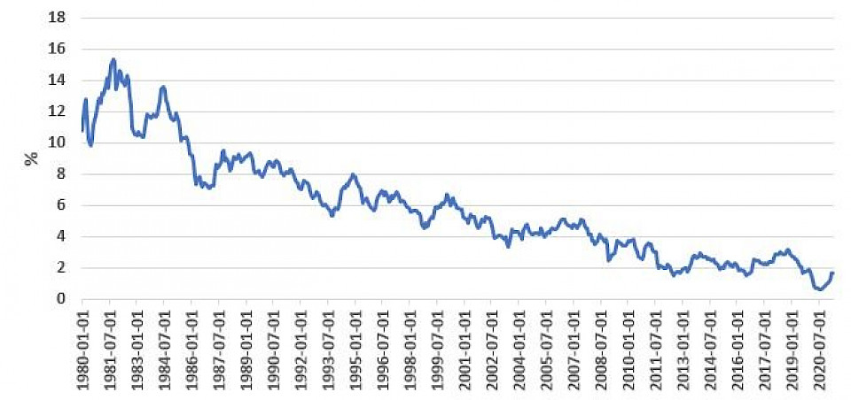 Rendite zehnjähriger US-Staatsanleihen in den vergangenen 40 Jahren