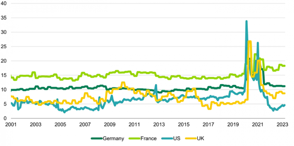 Interessant ist jedoch, dass sich die Sparquoten in den USA, Europa und Grossbritannien seit ihren jeweiligen Höchstständen unterschiedlich entwickelt haben. Die Grafik zeigt die Ersparnisse in Prozent des verfügbaren Einkommens auf der Grundlage von Monatsdaten. Am aussagekräftigsten erscheint uns der Vergleich des aktuellen Werts mit der Historie des jeweiligen Landes. Denn methodische Unterschiede, wie verschiedene statistischen Ämter das verfügbare Einkommen berechnen, mindert die Aussagekraft direkter Vergleiche zwischen verschiedenen Ländern.