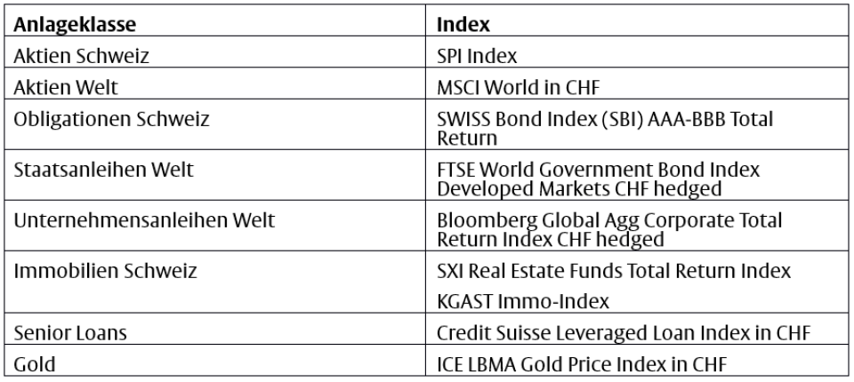 Die verbleibenden Anlageklassen im Beispiel-Portfolio sind Senior Loans und Gold. Bei Senior Loans handelt es sich um besicherte und oft variabel verzinste Kredite. Damit unterscheiden sie sich deutlich von den meist festverzinslichen Anleihen der Anlageklassen Obligationen Schweiz, Staatsanleihen Welt und Unternehmensanleihen Welt. Dieser Unterschied hat im aktuellen Jahr zur Dekorrelation beigetragen, da die festverzinslichen Anleihen mit den Zinserhöhungen der Notenbanken an Wert verloren haben.