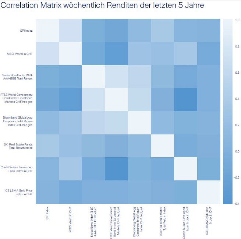 Massstab für die Diversifikationseigenschaften sind die Korrelationskoeffizienten zwischen den einzelnen Anlageklassen. Zur Berechnung werden die wöchentlichen Renditen herangezogen. Verglichen werden dann die Werte der letzten fünf Jahre mit denen des laufenden Jahres.