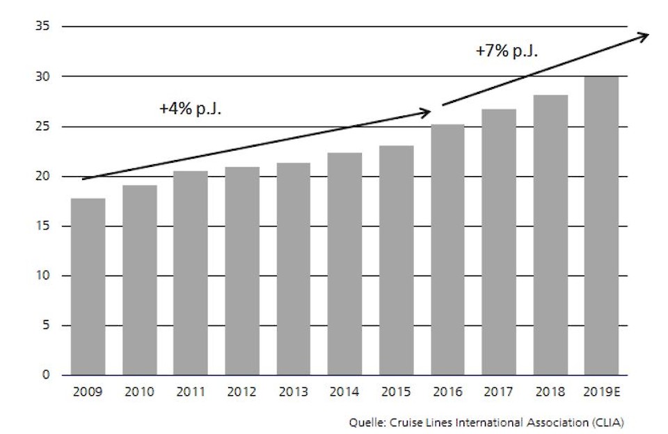 Die Kreuzfahrtindustrie stellt eigentlich mit ihren geschätzten 30 Millionen Passagieren im Jahr 2019 nur einen Bruchteil des globalen Tourismusmarktes dar. Philipp Mettler, Senior Analyst im globalen Aktienresearch des Asset-Management der Zürcher Kantonalbank, macht den Vergleich: Mehr als 40 Millionen Personen haben im vergangenen Jahr Las Vegas besucht. Global dominieren vier Konzerne die Kreuzfahrtindustrie: Carnival, u.a. mit den Marken Costa und AIDA (42% Marktanteil), Royal Caribbean Cruises, u.a. mit den Marken Celebrity und TUI (22%), Norwegian Cruise Line (8%) sowie MSC (7%).