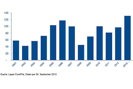2013 dürfte eines der bisher besten Jahre für Small-Cap-Fonds gewesen sein. Zuflüsse beliefen sich bis Ende November 2013 auf insgesamt 23,2 Mrd. Euro und sind damit auf dem Weg, sich zum bisher höchsten Gesamtjahresergebnis zu entwickeln.