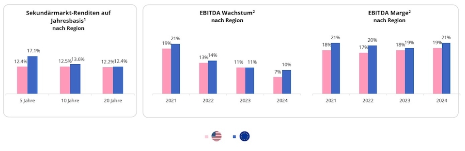 In den letzten zehn Jahren erzielten europäische Sekundärfonds durchweg Nettorenditen zwischen 12 und 17 Prozent und übertrafen damit häufig ihre US-amerikanischen Pendants, wie unten dargestellt. Noch wichtiger als die Zahlen ist jedoch, wie diese Renditen erzielt wurden – nämlich durch Fundamentaldaten wie Umsatzwachstum und Margenausweitung.