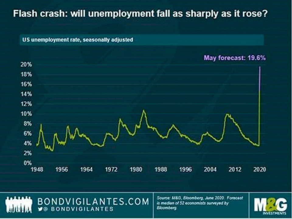 "Wo stehen wir momentan? Das Wirtschaftswachstum ist eingebrochen, die Arbeitslosigkeit ist sprunghaft gestiegen, und wir befinden uns jetzt an einem Wendepunkt, an dem das Wachstum wieder anziehen und sich schließlich auf einem relativ stabilen Pfad einpendeln wird – eine T-förmige Rezession in Form eines Flash Crashs, wie ich in meinem letzten Blog bereits schilderte", so Woolnough.
