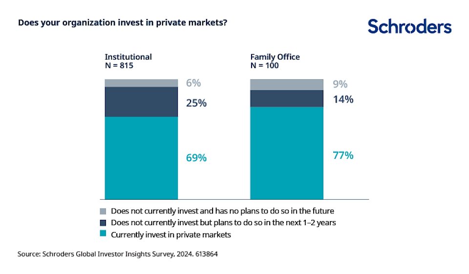 Es investieren nicht nur mehr Family Offices in private Märkte, sondern sie investieren auch deutlich mehr als andere Anlegertypen. Ein Drittel gibt an, dass die privaten Märkte 20 % oder mehr ihres Gesamtportfolios ausmachen, was ihre höhere Risikotoleranz und grössere Flexibilität bei der Auswahl der Anlagen unterstreicht. Darüber hinaus bieten ihre umfangreichen Netzwerke wahrscheinlich Zugang zu Nischen und attraktiven Anlagemöglichkeiten auf dem Markt.