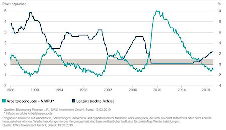Die Erfahrungen aus früheren Zyklen leisten nach DWS auch gute Dienste bei der Erklärung des aktuellen Verhaltens der Fed: Als die Arbeitslosenquote, die während der grossen Rezession auf 10 Prozent stieg, im Dezember 2015 auf ein Niveau nicht weit über NAIRU sank, vollzogen die US-Notenbanker die ersten Zinsschritte. Angesichts der zunehmenden Anzeichen für eine nachlassende Dynamik auf dem Arbeitsmarkt haben die Entscheidungsträger signalisiert, eine Pause einzulegen und sich die Wirtschaftsdaten anzusehen, bevor sie ihre weiteren Schritte festlegen und bekannt geben. Mit anderen Worten, die Geldpolitik der Fed werde von den eingehenden Daten abhängen.