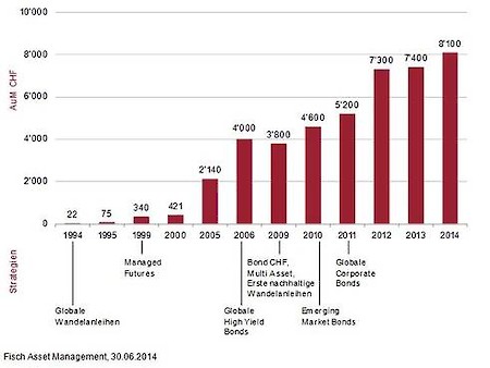 Im ersten Halbjahr 2014 verzeichnete der Wandelanleihen-Spezialist Fisch Asset Management einen Neugeldzufluss von CHF 421 Mio. Damit stiegen die verwalteten Vermögen um 9% von CHF 7.4 auf CHF 8.1 Mrd. Das Wachstum verteilt sich auf alle Anlageklassen und Kundensegmente. Dank neuen Produkten im Obligationen- und Multi-Asset-Bereich sind wir in der Lage, über den gesamten Marktzyklus hinweg und für alle Kundenbedürfnisse strategisch sinnvolle Lösungen anzubieten, erklärt Dr. Patrick Gügi, CEO von Fisch Asset Management, den Erfolg.