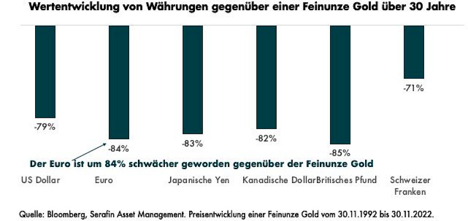 Für Gold legt sich Bernhard Graf ins Zeug. Langfristig hat das in Dollar gehandelte gelbe Metall selbst den starken Franken deutlich übertroffen (vgl. Grafik): "Gold bietet zwar nicht per se Schutz gegen Kosteninflation, aber es sichert den realen Wertverlust von Papierwährungen ab. Als solches ist es eine Absicherung gegen den möglichen Vertrauensverlust in Regierungen und Notenbanken", erläutert Graf.
