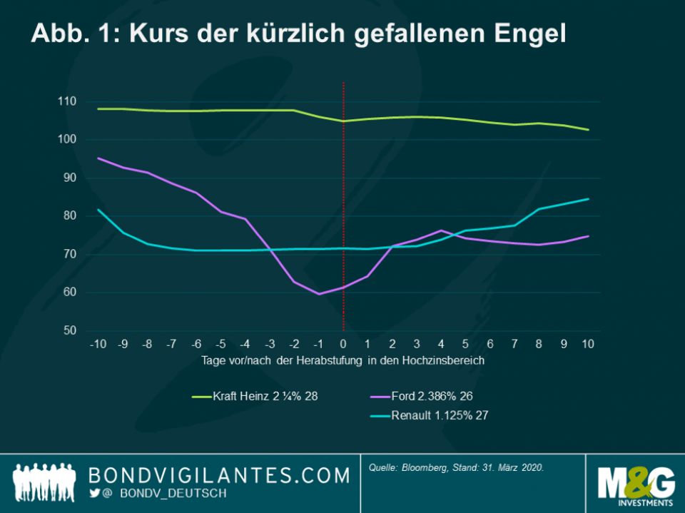 Die Corona-Pandemie und die niedrigen Ölpreise haben zu einem starken Anstieg von sogenannten "gefallenen Engeln" geführt. Das sind Unternehmen, die eine Herabstufung auf Sub-Investment-Grade erfahren mussten, dazu gehören Ford, Kraft Heinz, Renault und Marks & Spencer. Bei solchen herabgestuften Anleihen kommt es häufig zu Kursrückgängen.
