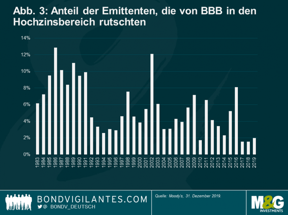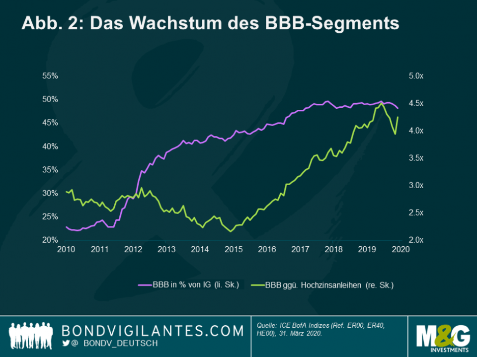 Der Umstand, dass immer mehr Anleihen mit BBB-Rating auf dem Markt sind, sei gut dokumentiert. Doch bis zur Corona-Krise seien die meisten Kommentatoren zuversichtlich gewesen, dass es zu keinem Anstieg der "gefallenen Engel" kommen werde. Auch die Rating-Agenturen schienen den Unternehmensleitungen bei fremdfinanzierten Übernahmen einen Vertrauensvorschuss zu geben.