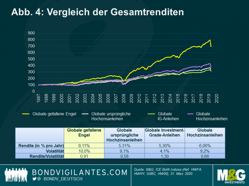 M&G Investments geht davon aus, dass die aktuelle Krise zu einem Anstieg von "gefallenen Engeln" führen wird. Dies werde kurzfristig Marktschwankungen zur Folge haben. Die Vergangenheit zeige jedoch, dass die Anleihen der überlebenden Unternehmen überdurchschnittliche Renditen erzielten.