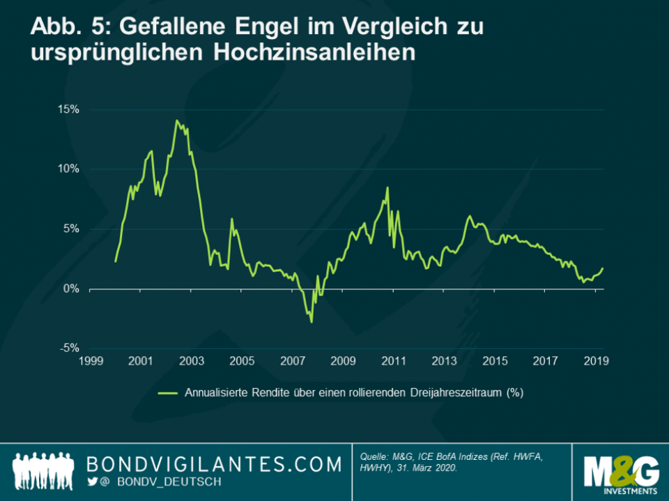 Diese überdurchschnittliche Wertentwicklung liege daran, dass die Kurse zunächst fallen und dadurch günstig werden und die überlebenden Emittenten auf längere Sicht eher als "aufgehender Stern" in den IG-Bereich zurückkehren als ursprüngliche Hochzinsemittenten.