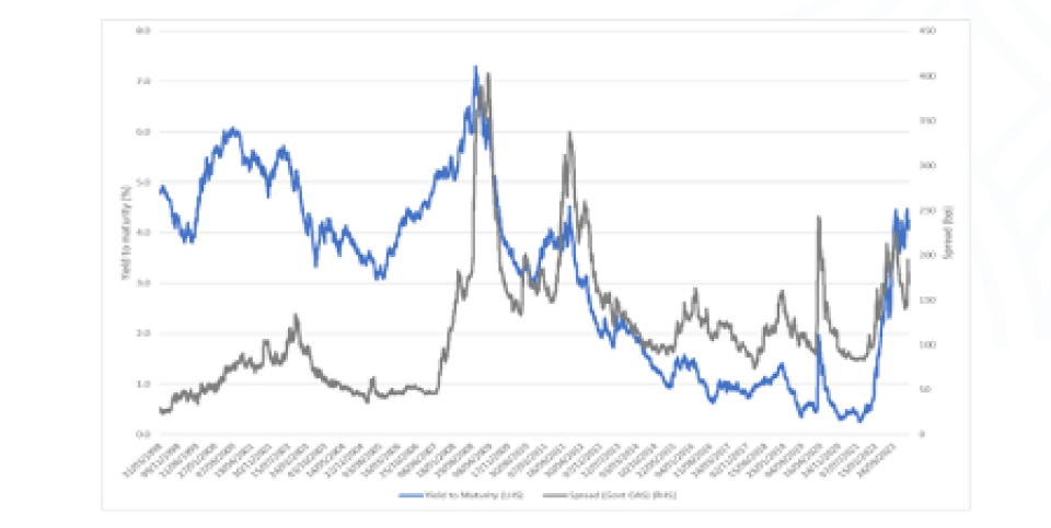 Quelle: Candriam, Bloomberg©, Stand: 31/03/2023. ICE BoA Euro Corporate Bond Index, Rendite bis zur Fälligkeit (LHS) und Spread (Govt OAS) (RHS). Die frühere Wertentwicklung eines bestimmten Finanzinstruments oder Index oder einer Anlagedienstleistung oder -strategie oder Simulationen früherer Wertentwicklungen oder Prognosen künftiger Wertentwicklungen sind keine Vorhersage künftiger Erträge.