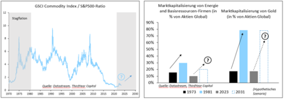 Bei einer Stagflation liegen die Anlagechancen hauptsächlich in realen Anlageklassen wie Gold und Rohstoffen. Diese konnten im letzten Jahrzehnt kaum Kapital anziehen und entsprechend niedrig ist die aktuelle Marktkapitalisierung von Rohstoff-Firmen und Gold im Vergleich zur Marktkapitalisierung des globalen Aktienmarkts mit Blick auf die Historie. «Eine Rückkehr dieser realen Anlageklassen in die Allokation der globalen Anlageportfolios hätte auch bei kleineren Umschichtungen bereits das Potenzial, deutliche Kurssteigerungen zu erzeugen», schreibt der Geschäftsführer von ThirdYear Capital.