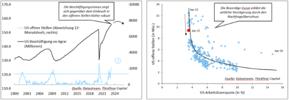 Sinkende Unternehmensgewinne führten schlussendlich mit einer typischen Verzögerung von 12 bis 18 Monate zu Entlassungen. So seien diese beispielsweise im Baugewerbe für private Neubauten in den USA auf breiter Basis denkbar und wären entsprechend ab dem dritten Quartal zu erwarten. Das Risiko einer zyklischen Rezession steige. Die aktuellen Arbeitsmarktzahlen aus den USA zeigten sich aber weiterhin sehr robust. Eine mögliche Erklärung für die «Übergangsphase» von der Reduktion der offenen Stellen bis hin zum Anstieg der Arbeitslosigkeit liefere die sogenannte «Beveridge-Kurve». Die Kurve ist bei besonders hoher Arbeitsnachfrage in der Ausgangslage steil, sodass eine Reduktion der Arbeitsnachfrage nicht direkt mit einer steigenden Arbeitslosigkeit einhergeht. In der Theorie würde das ein «Soft-Landing»- Szenario ermöglichen.
