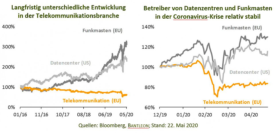 Ein gutes Beispiel für ein erfolgreiches Unternehmen mit eigener Netzinfrastruktur sei die Deutsche Telekom, welche mit mehr als 50'000 eigenen Funkmasten einer der grössten digitalen Infrastruktur-Betreiber Europas ist. Das Unternehmen meldete im April 2020 ein Plus von 76% bei den Festnetztelefonaten und einen Zuwachs von über 30% im Bereich Mobilfunk. Zudem habe die Deutsche Telekom mit den Quartalszahlen einen eindrucksvollen Beweis für die Krisenfestigkeit der Branche geliefert: Nahezu unbeeinträchtigt von der Coronavirus-Pandemie startet der Konzern mit einem operativen Ergebnissprung von 10% ins neue Geschäftsjahr und steht weiterhin zur bisherigen Prognose für 2020. Zudem brauche der Konzern aus heutiger Sicht keine staatliche Unterstützung und könne sich angesichts der Ergebnisentwicklung eine Ausschüttung leisten. Deshalb habe die Aktie seit Jahresbeginn nur 6%-Punkte eingebüsst (Stand: 25. Mai 2020), während die europäische Telekommunikationsbranche (SXKP) um 15% nachgab.