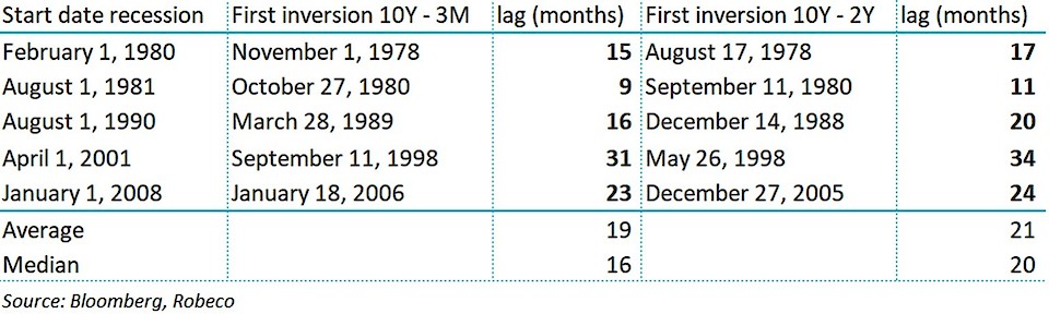 "Die Zinskurve hat sich als einer der besten, wenn nicht der beste, Rezessionsindikator erwiesen. Für die Renditekurve zwischen 10- und 2-jährigen Staatsanleihen verfügen wir über verlässliche Daten zu den letzten fünf Rezessionen in den USA. Alle wurden frühzeitig zutreffend prognostiziert", so Blokland. Der Zeitraum zwischen der erstmaligen Inversion der Renditekurve und dem Beginn der Rezession beträgt nach Angaben des National Bureau of Economic Research durchschnittlich 21 Monate. Dabei reicht die Bandbreite von 11 Monaten im Fall der Rezession von 1981 bis zu 34 Monaten, die der Rezession von 2001 vorangingen (vgl. Tabelle).