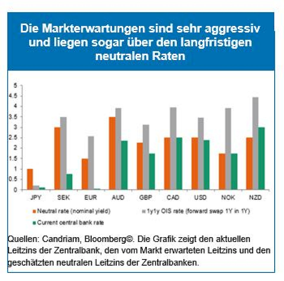 In diesem schwierigen Umfeld gibt es selbstverständlich nur wenige Gewinner und fast nur Verlierer. Konsens herrscht darüber, dass die Zentralbanken angesichts der fortgesetzt hohen, ja noch beschleunigten Inflation etwa im Euroland, den Straffungszyklus weiterführen müssen. "Die Markterwartungen sind gemessen am einjährigen Forward-Swap-Satz derzeit sehr aggressiv, da sie sogar die Terminzinsen der Zentralbanken über (geschätzt) langfristig neutrale Zinssätzen einpreisen", hält Candriam fest.