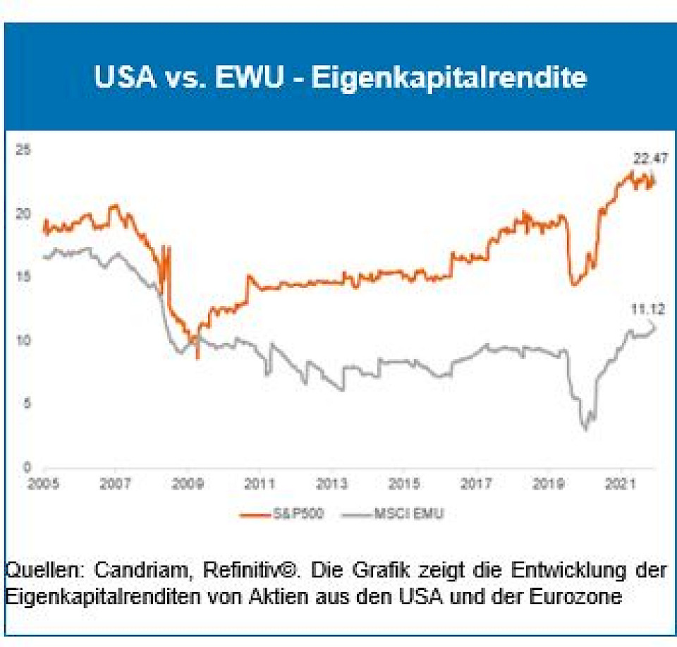 Während US-Aktien derzeit mit 1,5-fachen europäischer Aktien bewertet werden, scheint ihre Rentabilität doppelt so hoch zu sein. Die Eigenkapitalrendite (ROE) ist in den USA auf 22,5 gestiegen, in der Eurozone liegt sie bei 11,1. "Dieses Rentabilitätsgefälle kann durchaus die unterschiedliche Bewertung der beiden Regionen rechtfertigen."