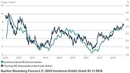 Beim Vergleich von 10-jährigen US-Staatsanleiherenditen mit dem vom Conference Board veröffentlichten US-Vorlaufindikator zeige der "Chart of the Week" von DWS eine markante Korrelation seit dem Beginn des Jahrzehnts. Im Jahr 2018 laufe die US-Wirtschaft auf vollen Touren. Nach einer Wachstumsrate von 4,2% (annualisiert) im zweiten Quartal meldete das Bureau of Economic Analysis in der ersten Schätzung 3,5% für das dritte Quartal. Kein Wunder angesichts des massiven Fiskalimpulses, vor allem in Form der Steuerreform, urteilen die Experten. Josh Feinman, US-Chefökonom der DWS, weist jedoch darauf hin, dass aktuell die vermutlich besten Zahlen zu sehen seien.