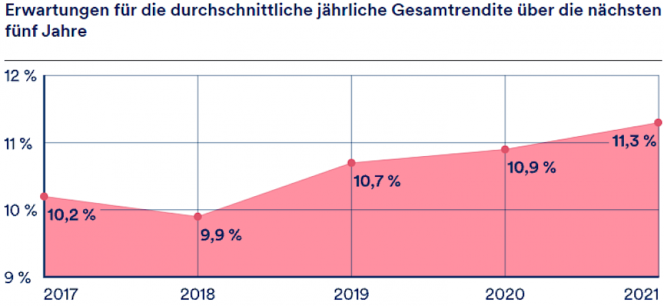 Doch nicht nur der Sparwille wird laut der Studie grösser, auch die Renditeerwartungen steigen. Trotz der Herausforderungen, die die Pandemie mit sich bringe, ist das Vertrauen der Anleger auf den höchsten Stand seit Studienbeginn im Jahr 2016 gestiegen. In den kommenden fünf Jahren erwarten die Studienteilnehmer jährliche Renditen von 11,3% (siehe Grafik unten). Und die Experten (12,5% Rendite p.a.) sind noch optimistischer gestimmt als die Laien (8,9% Rendite p.a.).