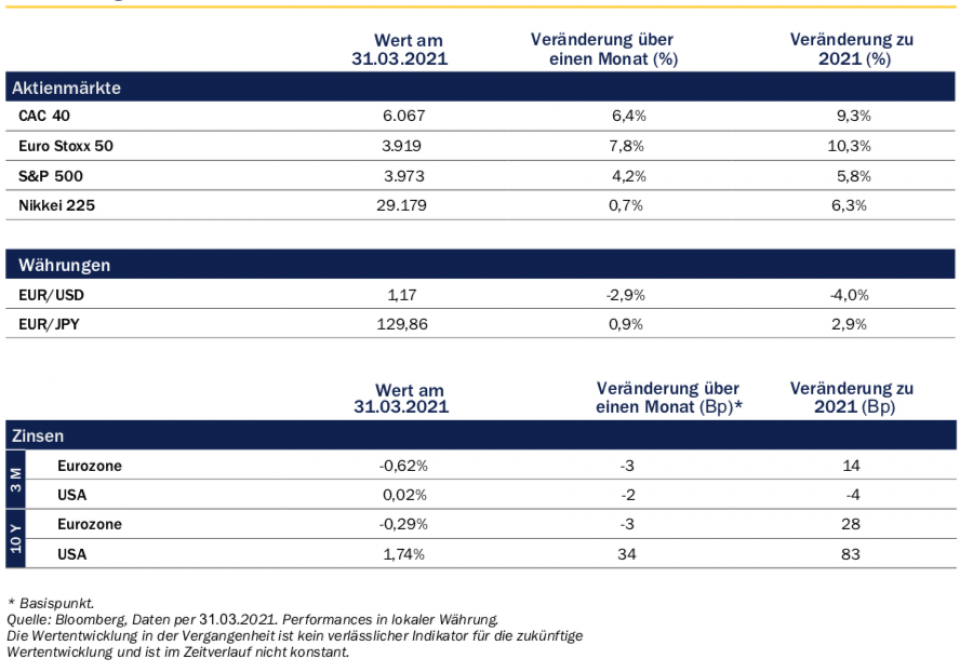 Tatsächlich haben sich die Konjunkturumfragen im März gefestigt, einschliesslich des ISM-Index für das nicht-verarbeitende Gewerbe. Dieser erreichte den höchsten Stand seit Beginn der Umfrage (1997), während der ISM-Index für das verarbeitende Gewerbe einen Höchststand seit den 80er Jahren verzeichnete. "Die US-Unternehmen sind zuversichtlich, dass die Aufhebung der Pandemie-Beschränkungen eine aufgestaute Nachfrage auslösen wird, und zwar obwohl Materialengpässe und Herausforderungen in der Logistik weiterhin die Lieferkette beeinträchtigen", meint Collard.