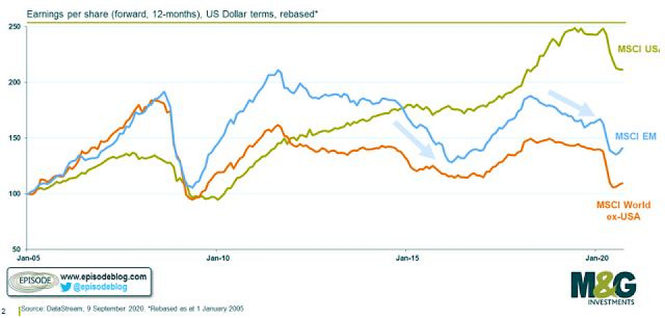 Seit der Finanzkrise haben sich die USA deutlich besser entwickelt als der Rest der Welt, denn Europa wurde ab 2011 von der Euro-Schuldenkrise erschüttert, derweil die Schwellenländer von 2014 bis 2016 und während des jüngsten Handelskriegs unter den sinkenden Rohstoffpreisen litten.