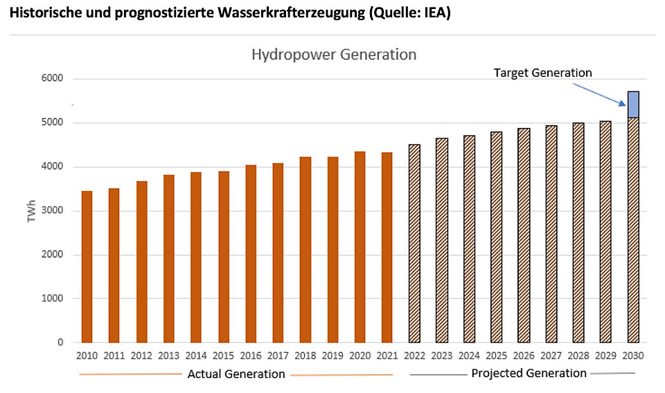 Wasserkraft bleibt daher eine Grundlage des Erzeugungsmixes auf dem von der Internationalen Energieagentur (IEA) vorgeschlagenen Weg zu einer Netto-Null-Energieversorgung bis 2050, auch wenn Solar- und Windenergie mehr Strom liefern. Die Wasserkrafterzeugung hat sich in den letzten 30 Jahren ungefähr verdoppelt. Um das von der IEA gesteckte Ziel zu erreichen, muss sich die Wasserkrafterzeugung in den nächsten 30 Jahren erneut verdoppeln, wobei der Schwerpunkt auf den Schwellenländern in Afrika, Asien und Lateinamerika liegt.