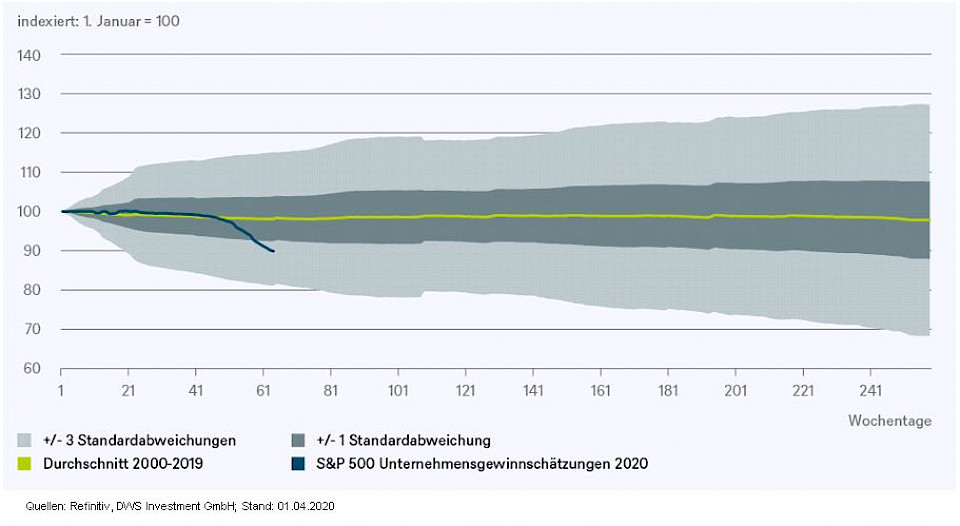 Die Schätzungen der Unternehmensgewinne im Jahr 2020 dürften demnächst weltweit drastisch nach unten revidiert werden. Wie hart könnte es den S&P 500 treffen, fragt DWS und gibt mögliche Antworten mit dem Chart der Woche.