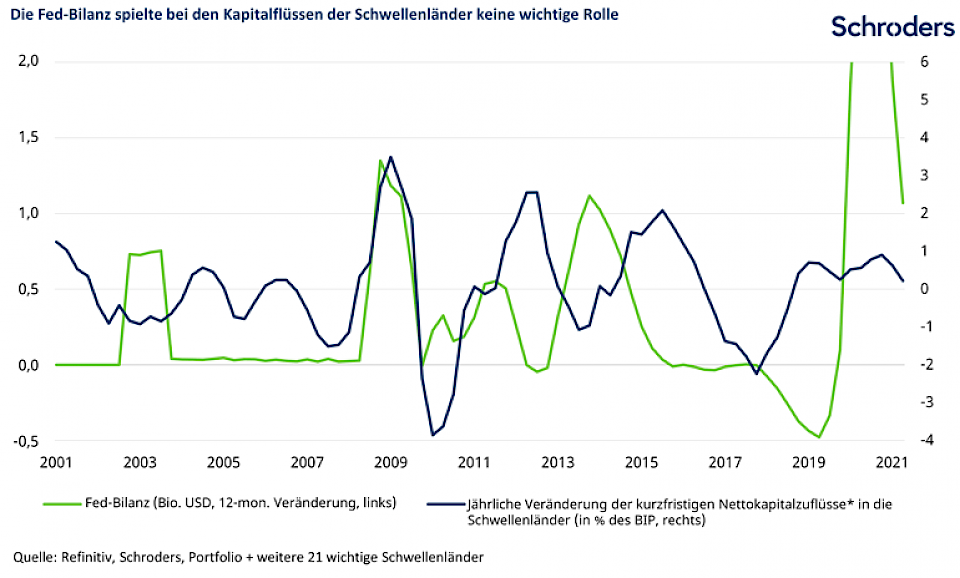 Doch sei der Zusammenhang zwischen den Veränderungen der Fed-Bilanz und den Schwellenländern nicht sehr eindeutig. Wenngleich die quantitative Straffung mit einem Ausverkauf von Schwellenländeranlagen zusammenfiele, bestehe zwischen den beiden keine enge Beziehung.