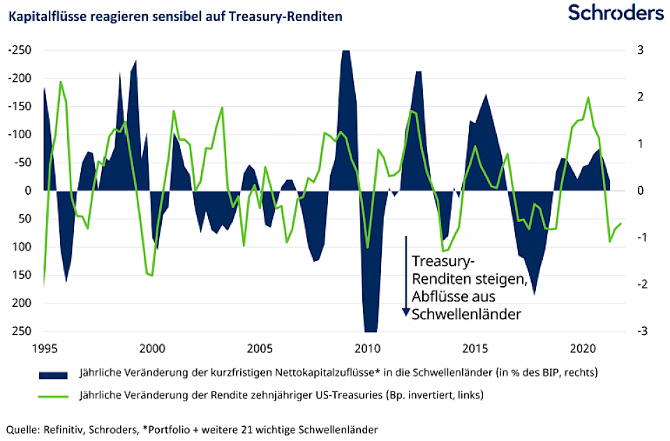 Während die Fed-Bilanz kaum mit den Kapitalströmen in die Schwellenländer in Beziehung stehe, bestehe ein eindeutiger Zusammenhang mit den Veränderungen der Treasury-Renditen. "Sollte die quantitative Straffung zu deutlich höheren Treasury-Renditen führen, könnten die Zuflüsse in die Schwellenländer und das Wachstum darunter leiden", so Rees.