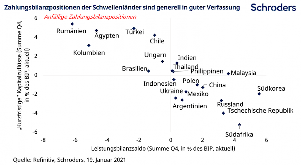 Vor einem Jahr vertrat Rees die Auffassung, dass die Schwellenländer weniger anfällig für einen Anstieg der Treasury-Renditen sind als in der Vergangenheit, da die Zuflüsse in die Schwellenländer systemisch schwach und die Aussenpositionen in relativ guter Verfassung waren. Es bestehe die Möglichkeit, dass höhere Energiekosten zu einer Verschlechterung der Aussenpositionen derjenigen Schwellenländer führen, die auf die Einfuhr von Rohstoffen angewiesen seien. Abgesehen von einer Handvoll kleiner Schwellenländer wie Rumänien, Ägypten und der Türkei böten solide Aussenpositionen jedoch nach wie vor einen Puffer gegenüber verschärften Finanzierungsbedingungen.