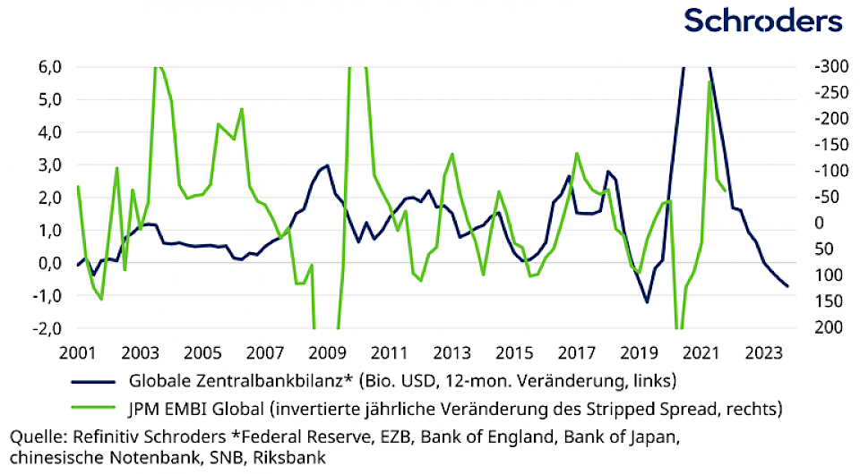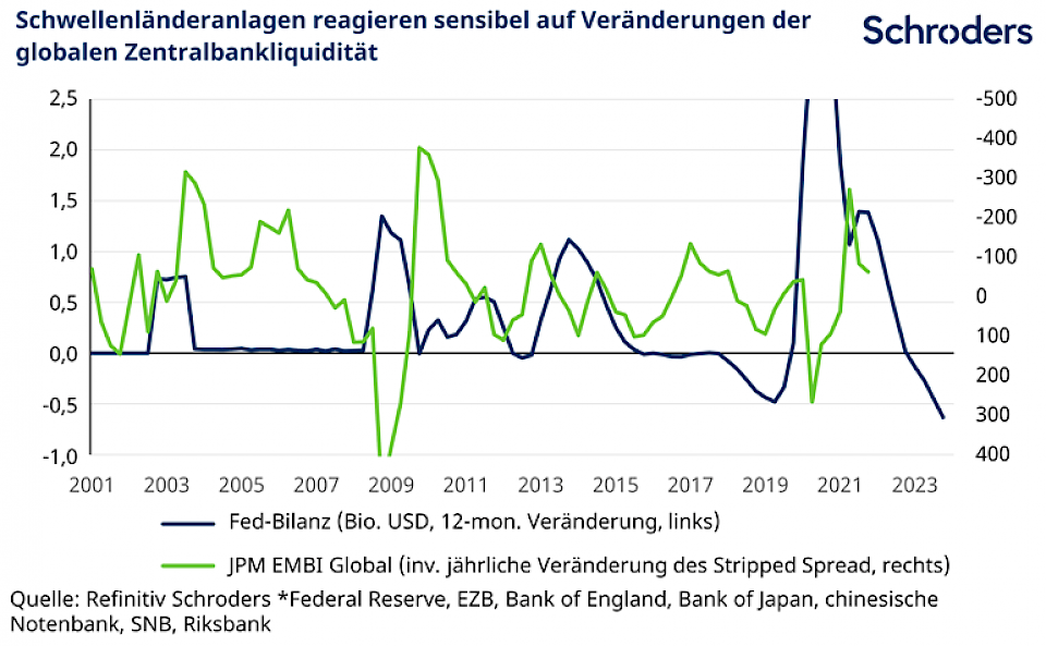 Unabhängig davon deuten gemäss Rees alle Zeichen darauf hin, dass die globale Zentralbankliquidität im Jahr 2023 zu schrumpfen beginnen wird. Auch wenn dies nicht die einzige treibende Kraft für die Performance der Märkte sei, so werde es doch wahrscheinlich Gegenwind für Schwellenländeranlagen bedeuten. "Auf US-Dollar lautende Anleihen haben in der Vergangenheit am stärksten auf eine quantitative Straffung reagiert, aber auch Aktien und Währungen werden anfällig sein", sagt der Schroders Experte abschliessend.