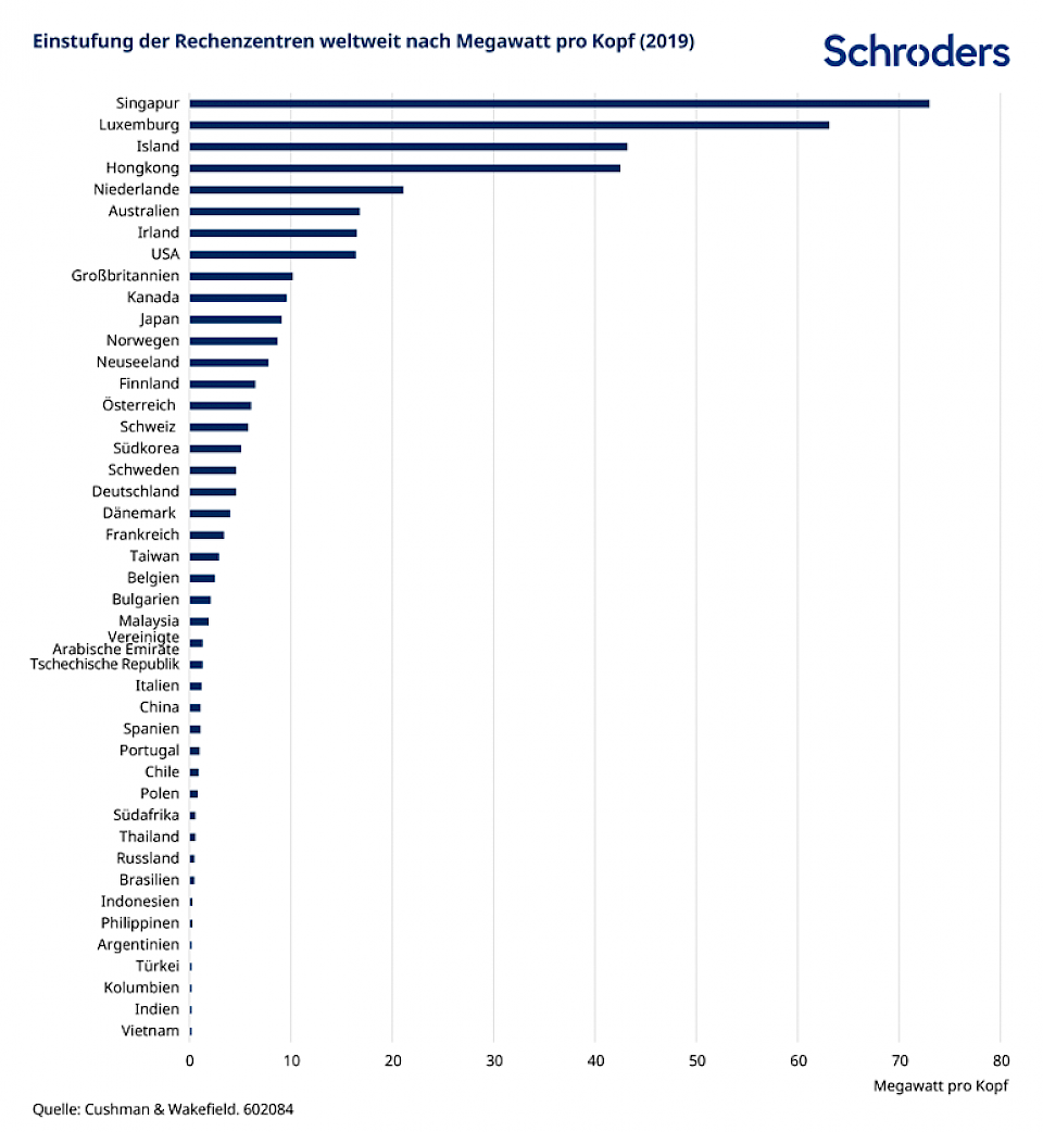 Davon profitieren Forsters Einschätzung nach die Nachbarländer Indonesien und Malaysia. "Sie zeichnen sich durch ein bemerkenswertes Bevölkerungswachstum, eine rasche Verbreitung der Internetnutzung und neue Landestellen für Unterseekabel aus. Die Bevölkerung Indonesiens war 2019 rund 50-mal größer als die von Singapur, dennoch verfügte die Republik nur über zirka ein Achtel der Rechenzentrumkapazität", so der Schroders Experte.