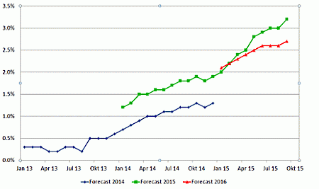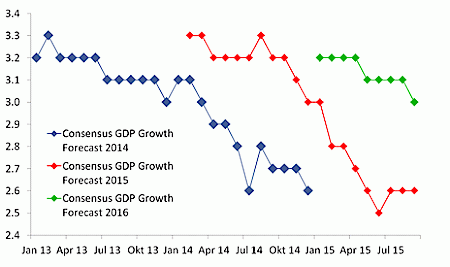 Die Prognosen für das globale Wirtschaftswachstum weisen ein wiederkehrendes Muster auf: Für gewöhnlich werden sie im Jahresverlauf nach unten geschraubt. Dabei ist es unerheblich, ob sie von Ökonomen des Privatsektors oder prestigeträchtigen Institutionen wie dem Internationalen Währungsfonds (IWF) oder der Organisation für wirtschaftliche Zusammenarbeit und Entwicklung (OECD) stammen. Insbesondere seit Ausbruch der Finanzkrise im Jahr 2008 sind solche Abwärtsrevisionen zu beobachten. So wurden auch die Prognosen für das Wirtschaftswachstum 2015 und 2016 angesichts der anhaltenden Schwäche in den Schwellenländern in gewohnter Manier gesenkt (siehe Grafik 1).