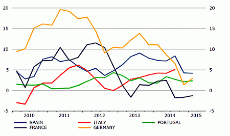 Spanien ist jedoch die Ausnahme, die die Regel bestätigt. Davon zeugen die erhöhten BIP-Prognosen für 2015 und 2016 (siehe Grafik 2). Mit steigenden Arbeitslosenzahlen, dem Kollaps des Wohnimmobilienmarktes und einer Rekordlast von faulen Krediten in den Bilanzen der spanischen Banken hat das Land unzweifelhaft eine schwere Krise erlebt. Doch nach schmerzhaften Reformen der Arbeits- und Produktmärkte sowie der Rettung des Bankensystems haben sich Geschäfts- und Verbrauchervertrauen wieder aufgehellt. Das BIP-Wachstum dürfte 2015 in Spanien über 3 Prozent liegen; zudem werden Arbeitsplätze geschaffen. Die Direktinvestitionen aus dem Ausland ein Zeichen grösserer Wettbewerbsfähigkeit steigen und haben in den vergangenen zwölf Monaten sogar die entsprechenden Zahlen in Deutschland übertroffen (siehe Grafik 3). Die dank des Liquiditätsprogramms der Europäischen Zentralbank (EZB) rekordtiefen Zinssätze, die niedrigeren Energiepreise und der schwache Euro verleihen der spanischen Wirtschaft ebenfalls kräftig Schwung.