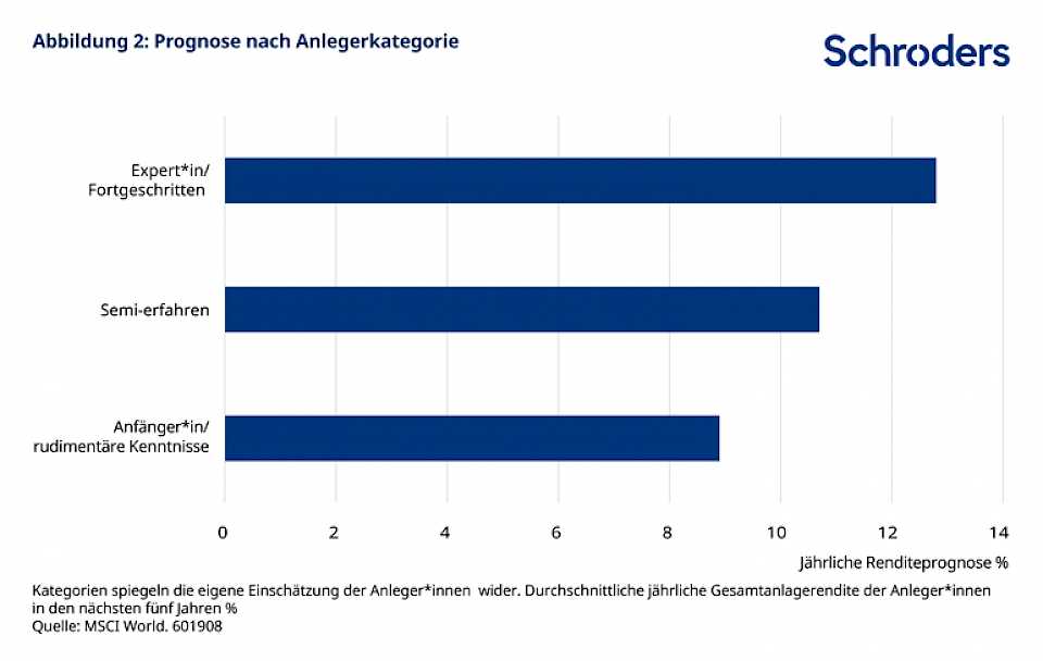 Ein faszinierender Aspekt der diesjährigen Studie ist, dass diejenigen Investierenden, die sich als «Experte» oder Anleger mit «fortgeschrittenen» Finanzkenntnissen einstufen, auch die höchsten Renditeerwartungen haben. Diejenigen Anleger, die sich als «Experte» sehen, erwarten im Durchschnitt um 43 % höhere Renditen pro Jahr als diejenigen, die sich als «Anfänger» oder Anleger mit «rudimentären» Kenntnissen einstufen.
