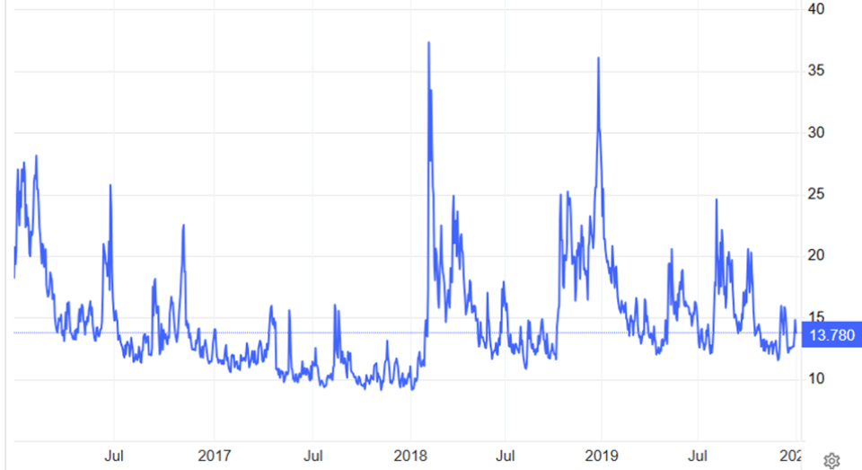 S&P 500 Volatilitätsindex (VIX) vor und während Trumps erster Amtszeit 2016-19, in %