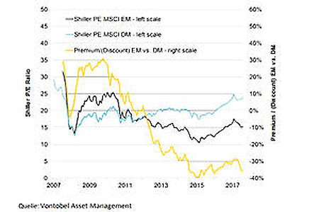 Diese gesamtwirtschaftlichen Gründe seien nachvollziehbar, und die Korrektur habe zu attraktiven Bewertungen geführt, so die Experten. Auf Basis des Shiller-KGV ist der Abschlag auf Schwellenländer-Aktien im Vergleich zu den Titeln aus Industrieländern in den letzten zwei Monaten auf mehr als 36 Prozent gestiegen. Damit ist beinahe der langjährige Tiefpunkt von 40 Prozent von Anfang 2016 erreicht (Grafik 3). Solche niedrigen Bewertungen könnten ein erstes Anzeichen einer Erholung sein. Jedenfalls lehre uns das die Geschichte die schnelle Erholung der EM-Aktien Anfang 2016 ist ein Beispiel dafür, sind sich Merz und Schaffner einig. Ausserdem sei nicht zu vergessen, dass die langfristigen Wachstumsperspektiven in den Schwellenländern im Vergleich zu den entwickelten Märkten sehr attraktiv bleiben.
